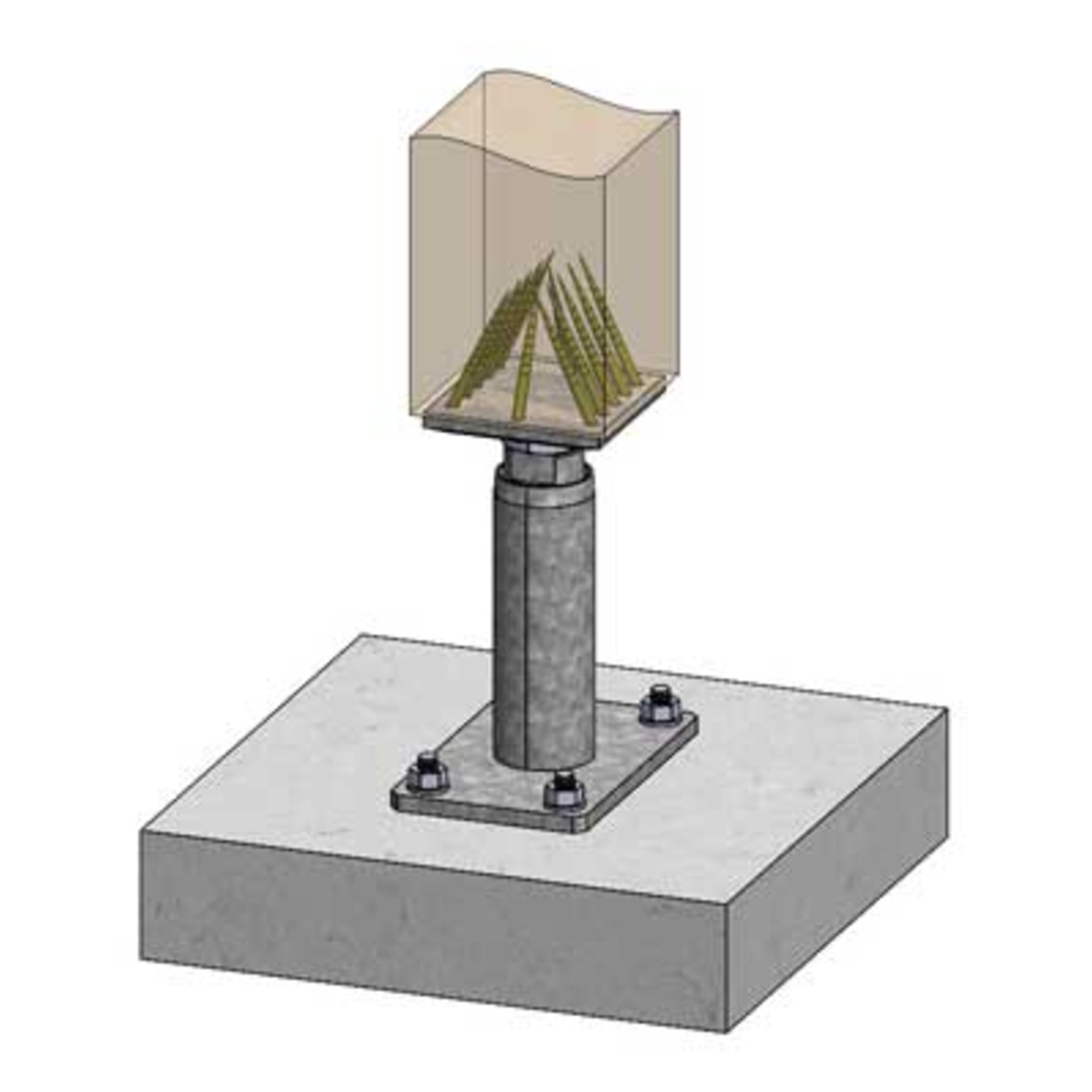 Für die Montage wird der Pfostenträger stirnseitig mit Holzbauschrauben der Größe 5 x 80 befestigt. Nach der Höheneinstellung wird er mit Kontermuttern fixiert. Die Verbindung mit dem Beton erfolgt über Ankerbolzen.