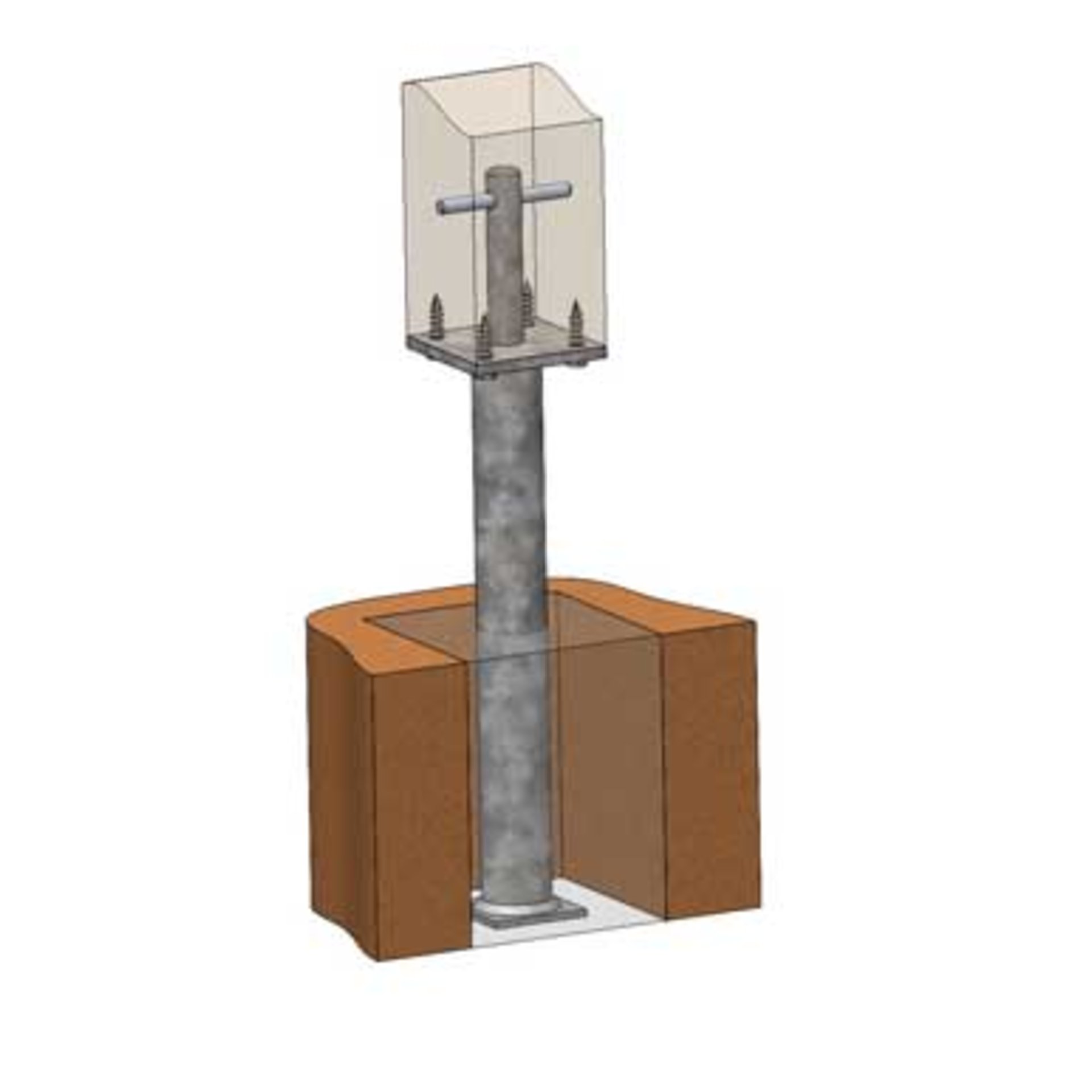 Der Pfostenträger wird direkt einbetoniert. Für die Montage wird der Pfostenträger stirnseitig in einer Bohrung